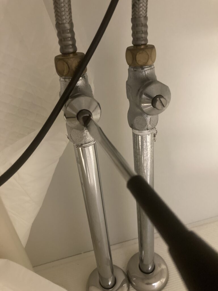 マイナスドライバーで水栓をキュっと締め、まずは水を止めます。