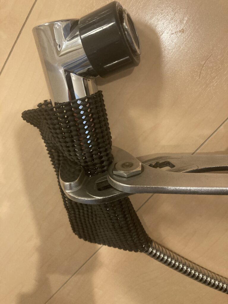 ナットを回すとき、ホース内部の水が垂れてくることもあるので、